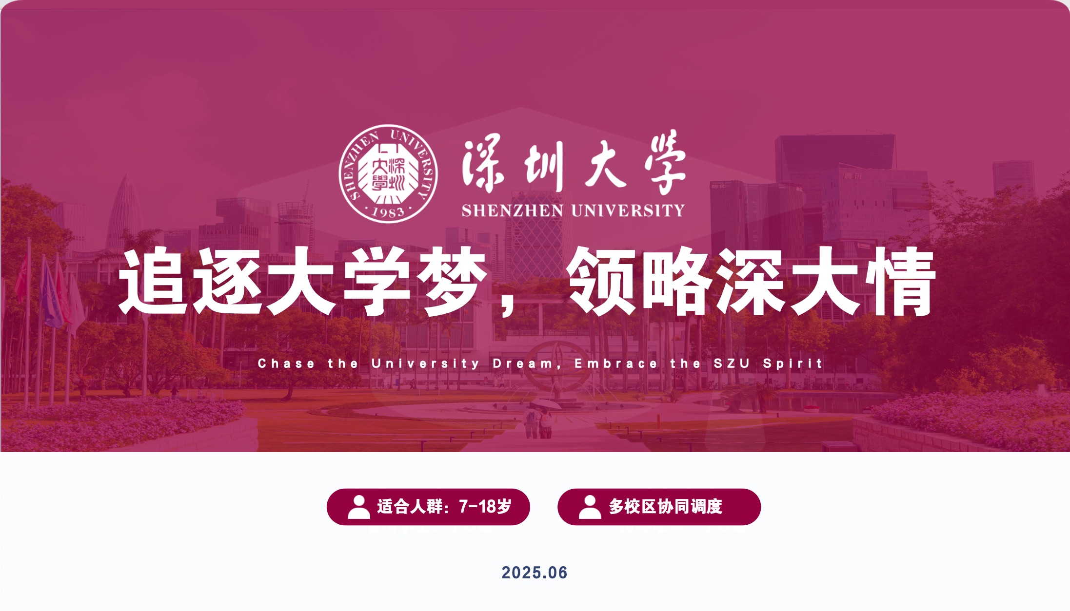 以学生的实际需求,策划一次突破传统课堂,真实领略大学的研学之旅。这一独特的探索之旅,会带你们走入腾讯创始人的母校“深圳大学”,实地接触顶尖学府,通过大学参访、学霸分享、走进校园等方式,对大学进行全方面挖掘。