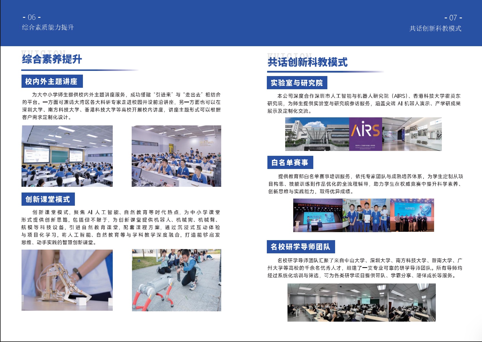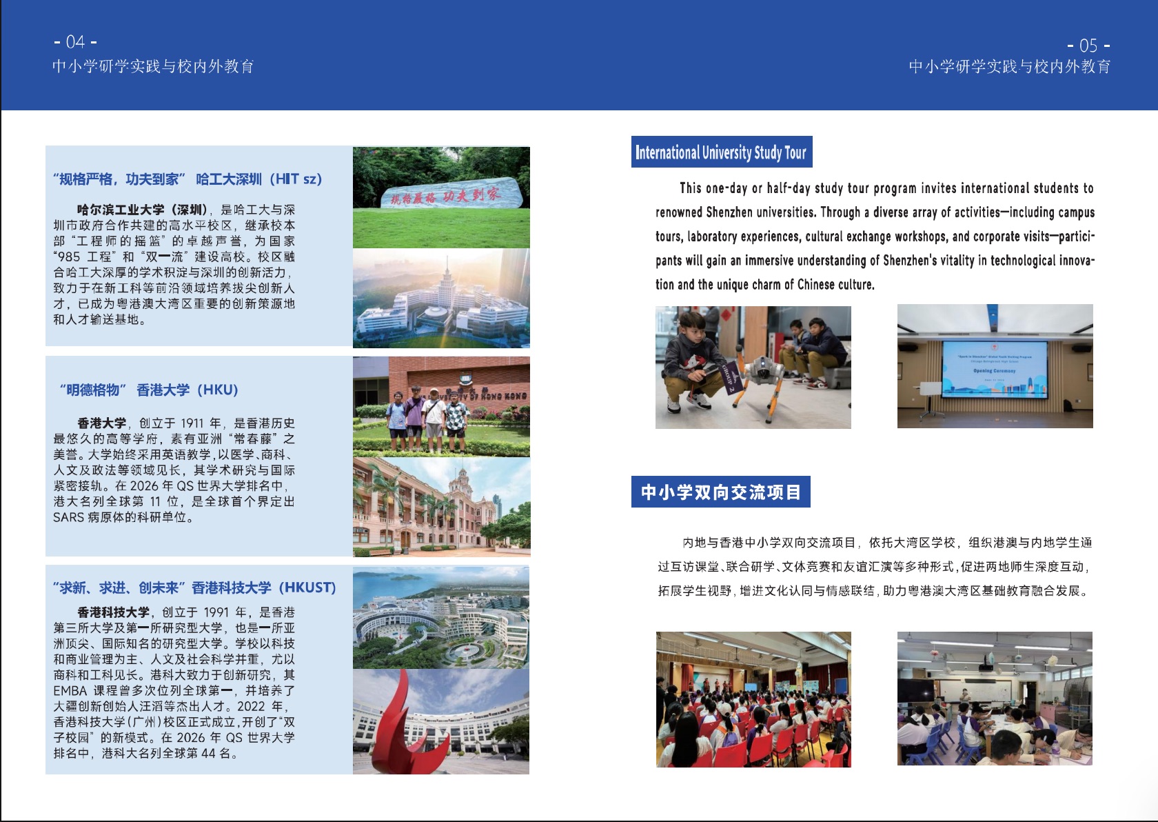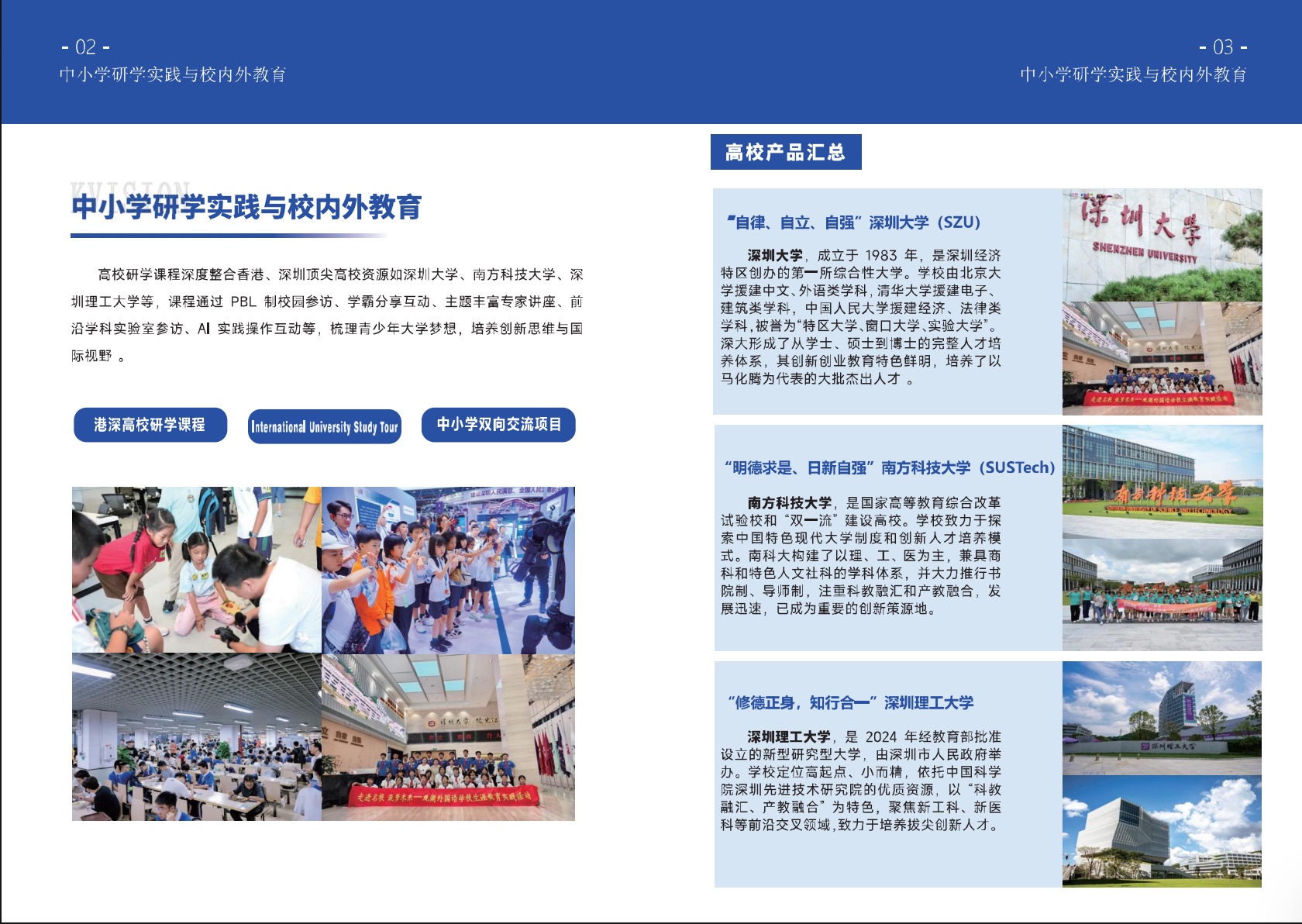 以“遇见科学,遇见未来”为核心理念,依托深圳与香港两地丰富的高校及中小学资源,构建贯通大中小学的创新型研学与交流体系,不仅与深圳大学、南方科技大学、深圳理工大学、香港城市大学(东莞)、哈尔滨工业大学(深圳)、香港大学、香港科技大学等国际学府落建立联系,还广泛联结深港两地中小学,构建涵盖高等教育、基础教育,并延伸至国际平台的多元教育生态圈。 港深科见主营业务体系覆盖:中小学研学实践与校内外教育、综合素质能力提升、创新科教模式等,以多种创新教育实践模式为载体,助力青少年拓展国际视野、激发科学兴趣、培育创新精神。